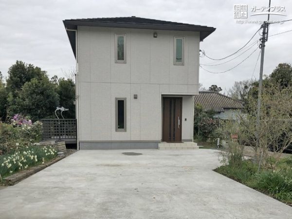 雑草対策をしたいとご依頼をいただき、広い敷地の植栽スペース以外のファサード部分と建物まわりに土間コンクリートを打設しました。雑草を抑制するほか、水たまりもできにくくなり、お車の乗り降りや歩行も快適です。