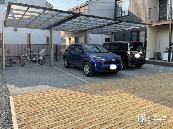お庭を解体し、駐車スペースに転用する工事をご依頼いただきました。既存の門柱やお庭の芝生を撤去し、お車2台分の広さを確保して土間コンクリートを打設。また「YKKAP エフルージュツインプラスFIRST」のカーポートを設置しました。オプションを利用して、柱に門柱の機能をプラス。門柱がないため、既存の駐車スペース側の間口も広くなり、気兼ねなくお車の入出庫ができるようになりました。フラットな直線ラインが美しい屋根が、よりお住まいをモダンに引き立てます。