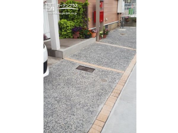 アプローチ・駐車スペース:土間コンクリート洗い出し仕上 + レンガ目地