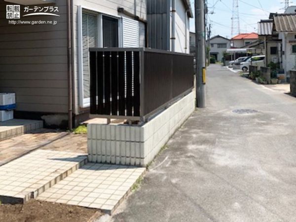 門まわりとテラスのリフォームを承りました。既存のタイル塀を一部だけ残し、門扉と一緒に撤去。残したタイルの塀を基礎として、木目調のフェンスを設置しました。気になる通行人やご近所の目を遮ります。