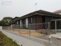 新築のお住まいの外構工事を承りました。駐車スペースには土間コンクリートを打設し、2台分の大きなカーポートを設置。主庭と建物の間には高低差があるため、玄関ポーチには階段を追加しました。また南側の擁壁上には、お庭からの飛び出しを防ぐメッシュフェンスを設置しています。