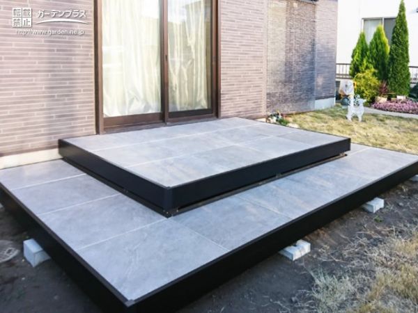 老朽化したウッドデッキを撤去し、新たにタイルデッキを設置しました。モノトーンの色合いがエレガントな印象。ウッドデッキとはまた違う高級感で、ゆとりのあるプライベート空間を演出します。