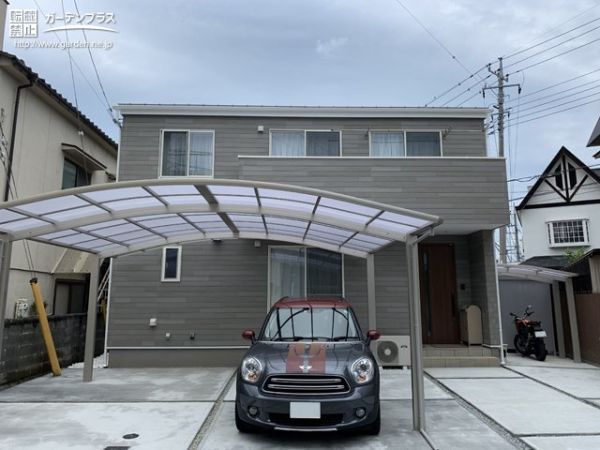 土間コンクリートが打設された新築のお住まいに、エクステリアの設置工事を行いました。2台分のカーポートやサイクルポート、物置を設置。またお庭の裏手にも道路に出入りできる間口があるため、バイクや自転車が通りやすい伸縮門扉を設けました。様々な機能のあるエクステリアはお庭の使い勝手を向上させ、暮らしやすさに貢献します。